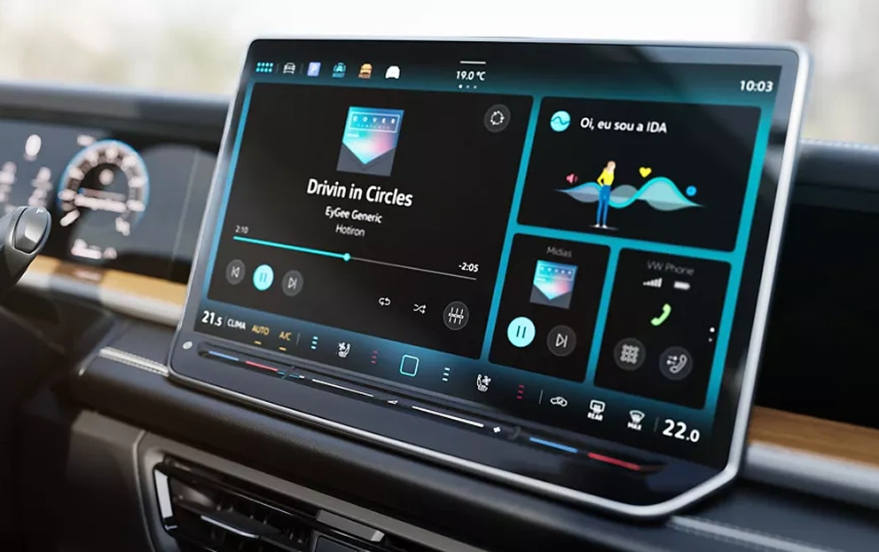 No console central, o destaque fica com a nova central multimídia de 15 polegadas, totalmente customizável, com Apple CarPlay e Android Auto sem fio e a nova assistente de voz IDA. Todas as funções do carro podem ser configuradas pela tela, assim como os controles do ar-condicionado, sistema de som, entre outros.